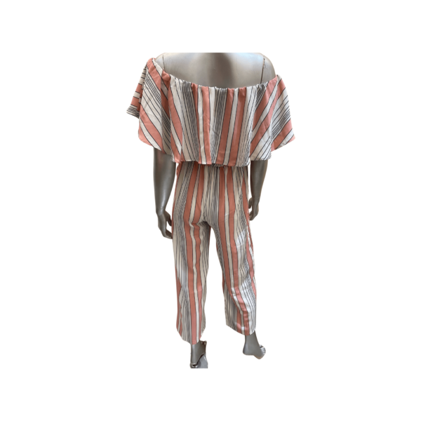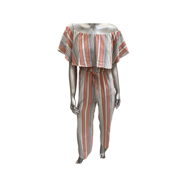 • Peach And White Striped, Off Shoulder Jumpsuit.