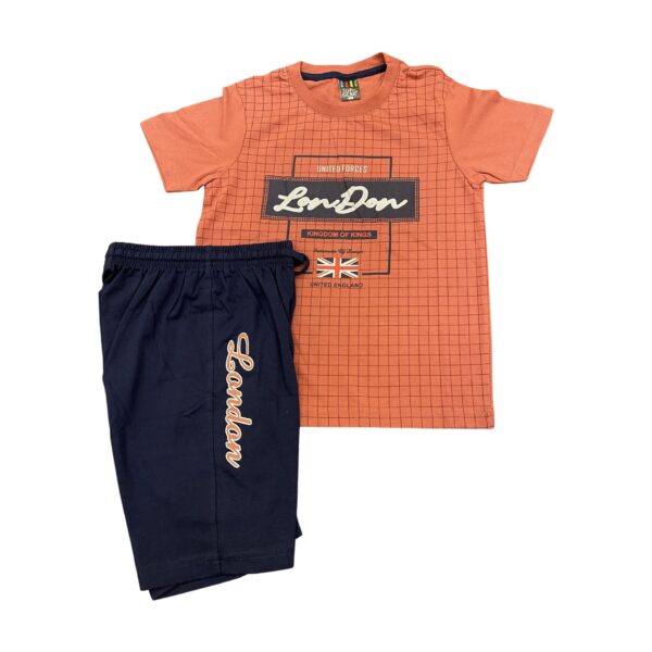 • Hosiery Half sleeves summer set. Check printed peach t-shirt, half sleeves hosiery with half pants.